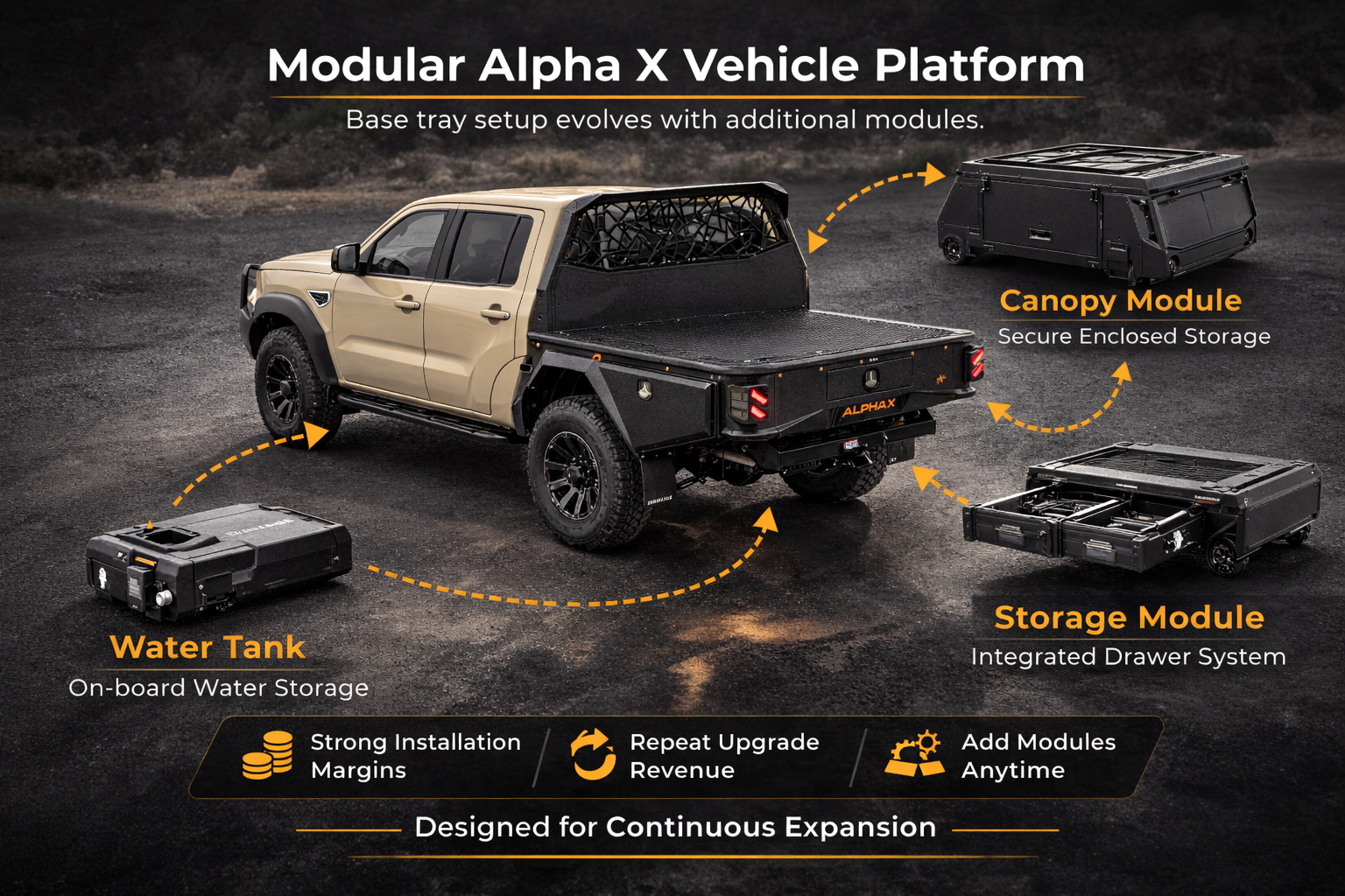 A modular vehicle platform designed to create strong installation margins today and long-term upgrade opportunities for authorised Alpha X partners.